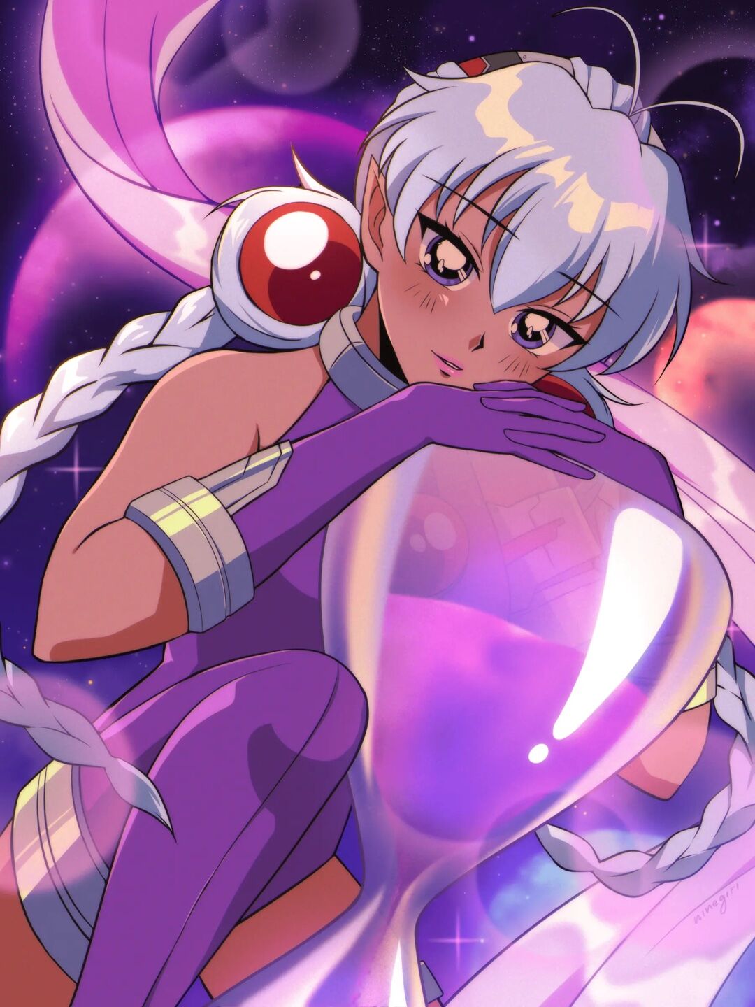 Celebrating the release of the Shinsei Galverse anime, this piece honors the community and creators whose love and patience helped birth its dazzling galactic world. The hourglass is a reference to the anime's credits, symbolizing the time and devotion that turned Galverse into the retro anime icon it is today.
